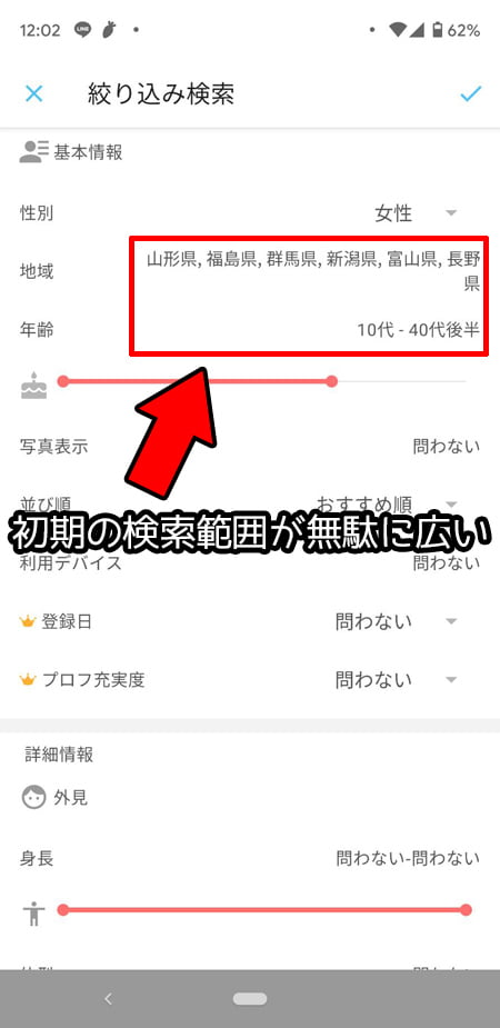 最初は登録地域を中心に超広範囲に設定されているので、これを自分の現在の県のみに絞りなおして検索するのをオススメします。